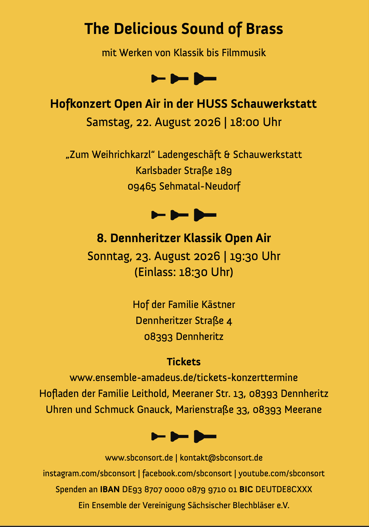 « Alle Veranstaltungen SBC Sommertournee 2026 22. August 2026 bis 23. August 2026 « 17. Sächsische Blechbläserweihnacht 2025 | Sächsisches Blechbläser Consort Zum Kalender hinzufügen Google Calendar iCalendar Outlook 365 Outlook Live Details Beginn: 22. August 2026 Ende: 23. August 2026 Veranstaltungskategorie: Sächsisches Blechbläser Consort